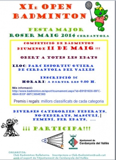El proper Diumenge 11 de Maig, amb motiu de la Festa Major del Roser, el Club Bàdminton Bellaterra amb el suport de l'Ajuntament de Cerdanyola del Vallés, organitza el XIé Open de Bàdminton a Cerdanyola del Vallés que tindrà lloc al Parc Esportiu Guiera.